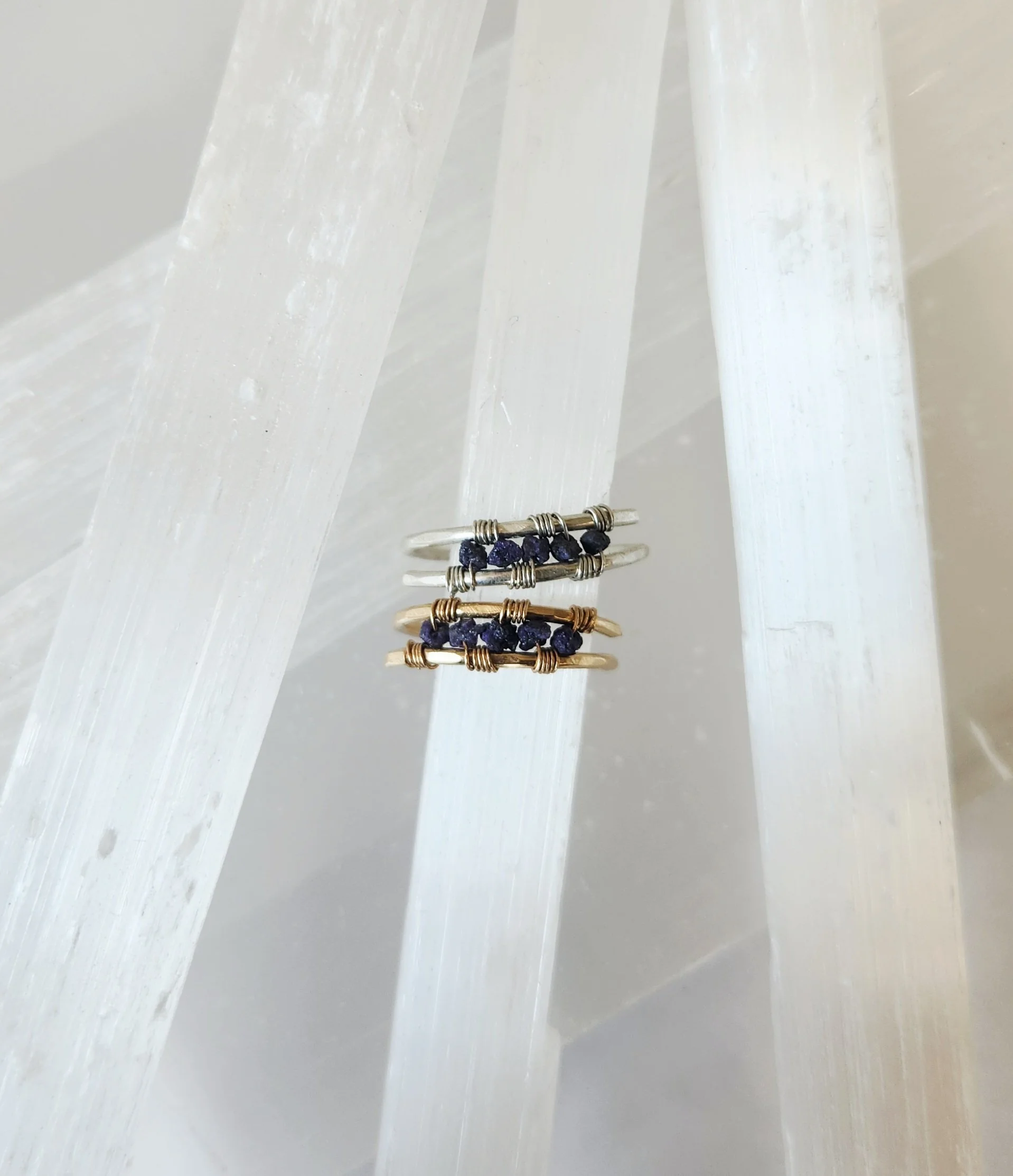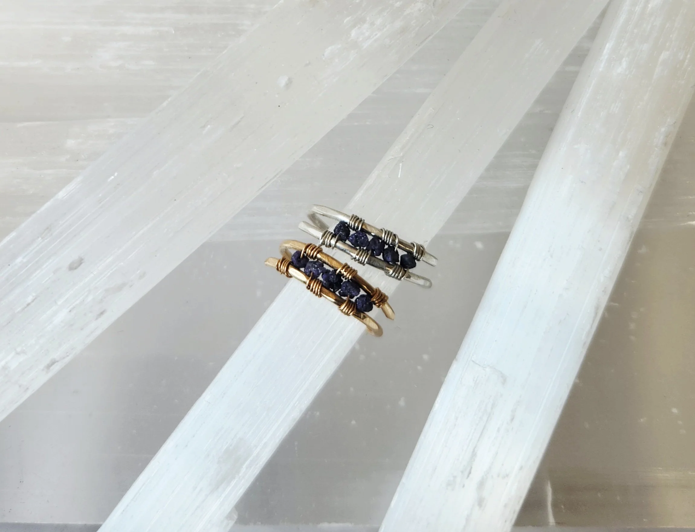 Natural purple diamonds sparkle like stars in this elegant with an edge ring. The ring is hand formed and forged wire of 14 karat yellow gold fill or sterling silver. Available in whole sizes only 4-9. Metaphysical properties of this gemstone include abundance, clarity, energy and power.