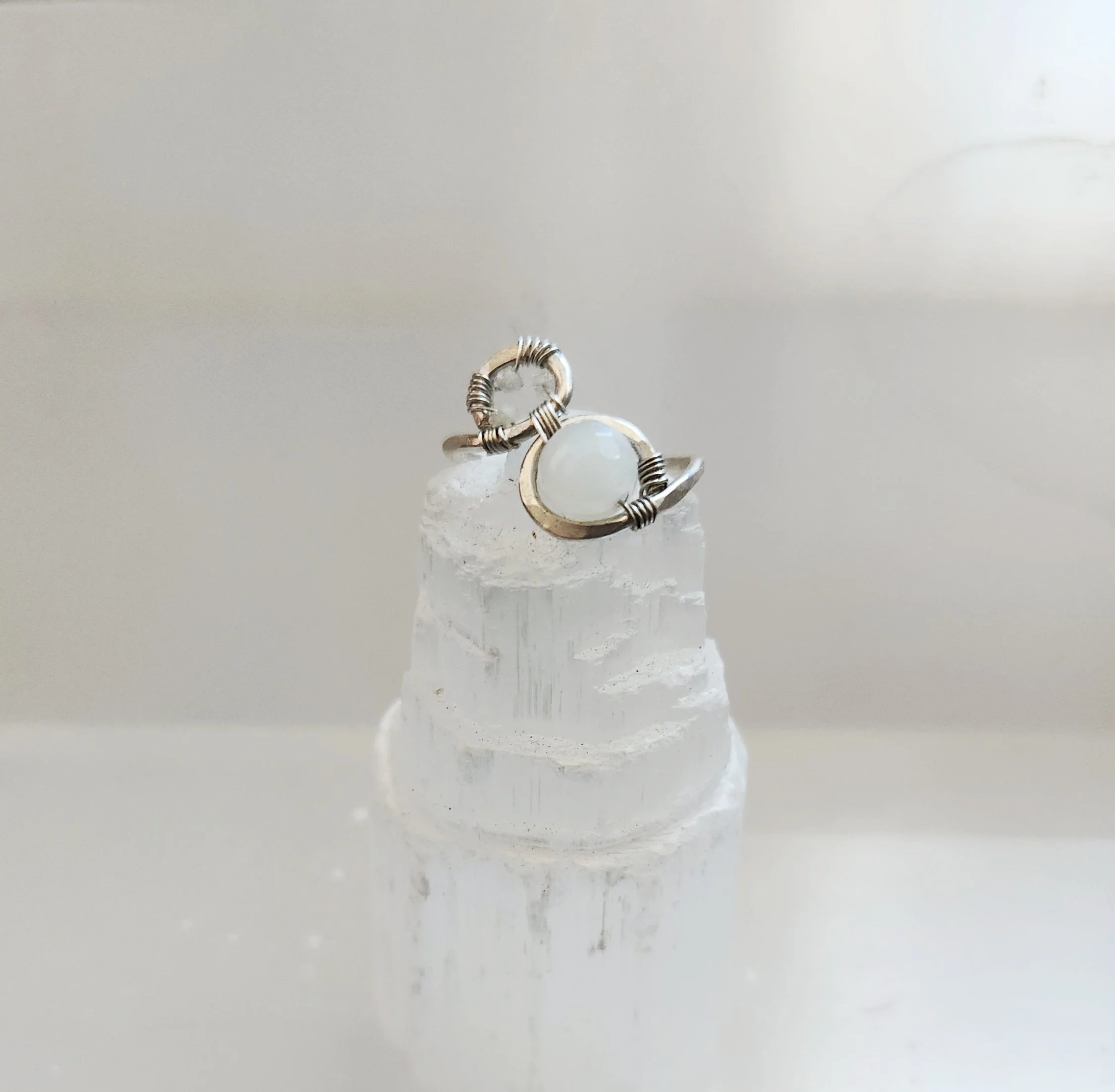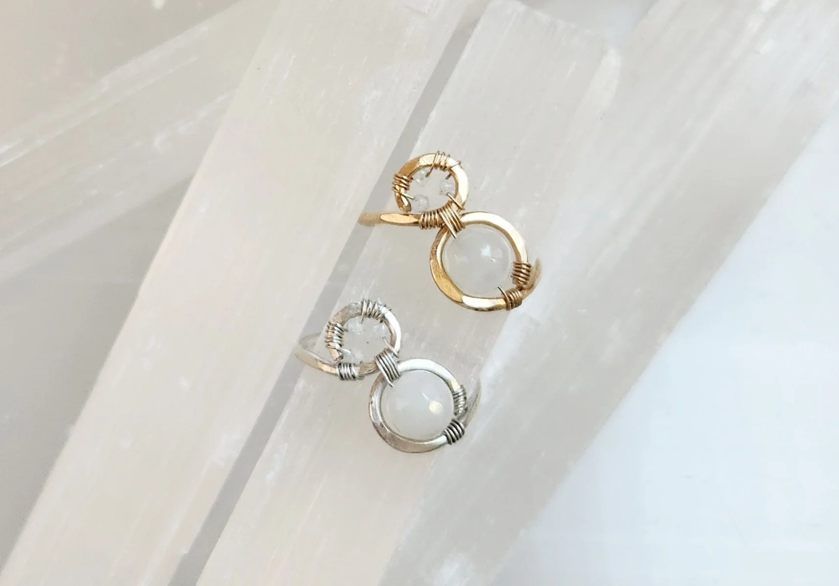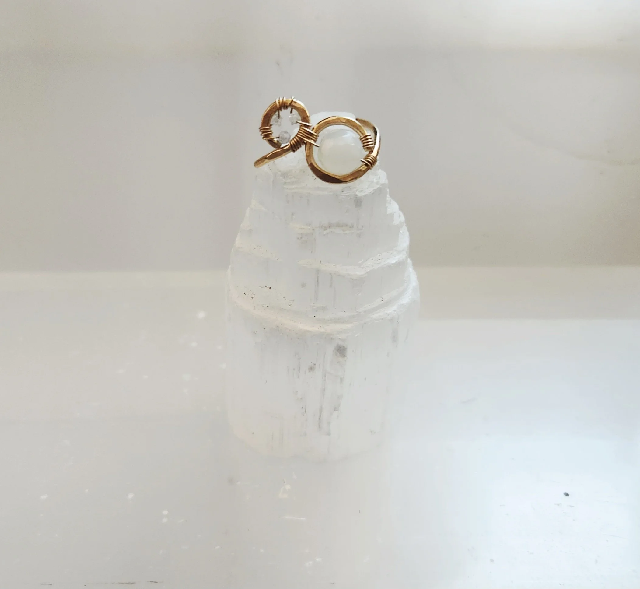 Hand formed ring available in Sterling Silver or 14 Karat Gold fill wire featuring a stunning sparkly faceted rainbow moonstone gemstone bead accented with raw natural white diamonds. Made to order; available in whole sizes only.