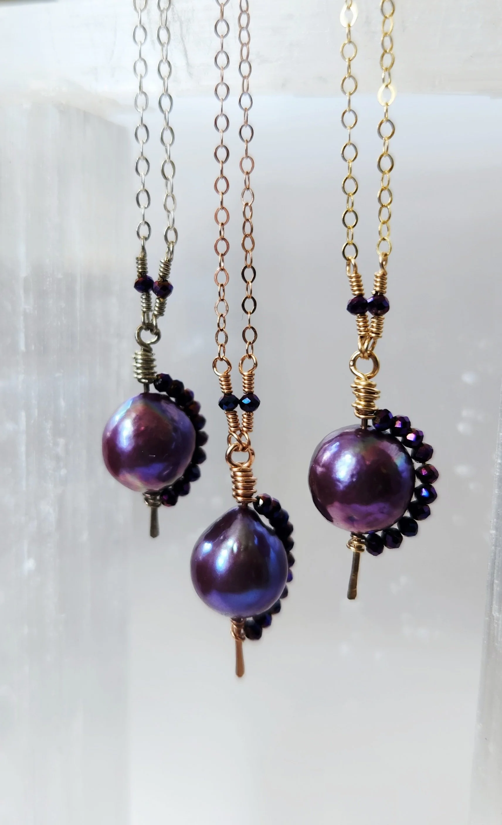 Absolutely luminous purple freshwater baroque pearls with overtones of pinks,greens, blues,purples,golds. Perfectly accented with Mystic Black Spinel. Available in your choice of 14 karat yellow or pink gold and sterling silver. I only have 1 strand of these stunning pearls, so when they're gone they're gone. 21" in length.