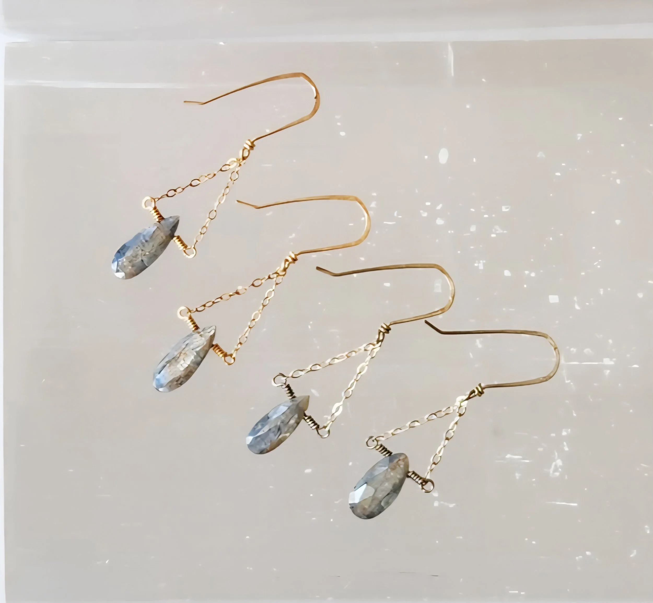 Mystic Blue Kyanite faceted elongated pear gemstones, beautiful color variations. Accented with fine gauge chain and hammered fish hooks. Approximately 2.5" long. Available in sterling silver and 14 karat yellow gold fill. Please not due to the nature of the stone no 2 stones are exactly alike. Pairs matched for size.
