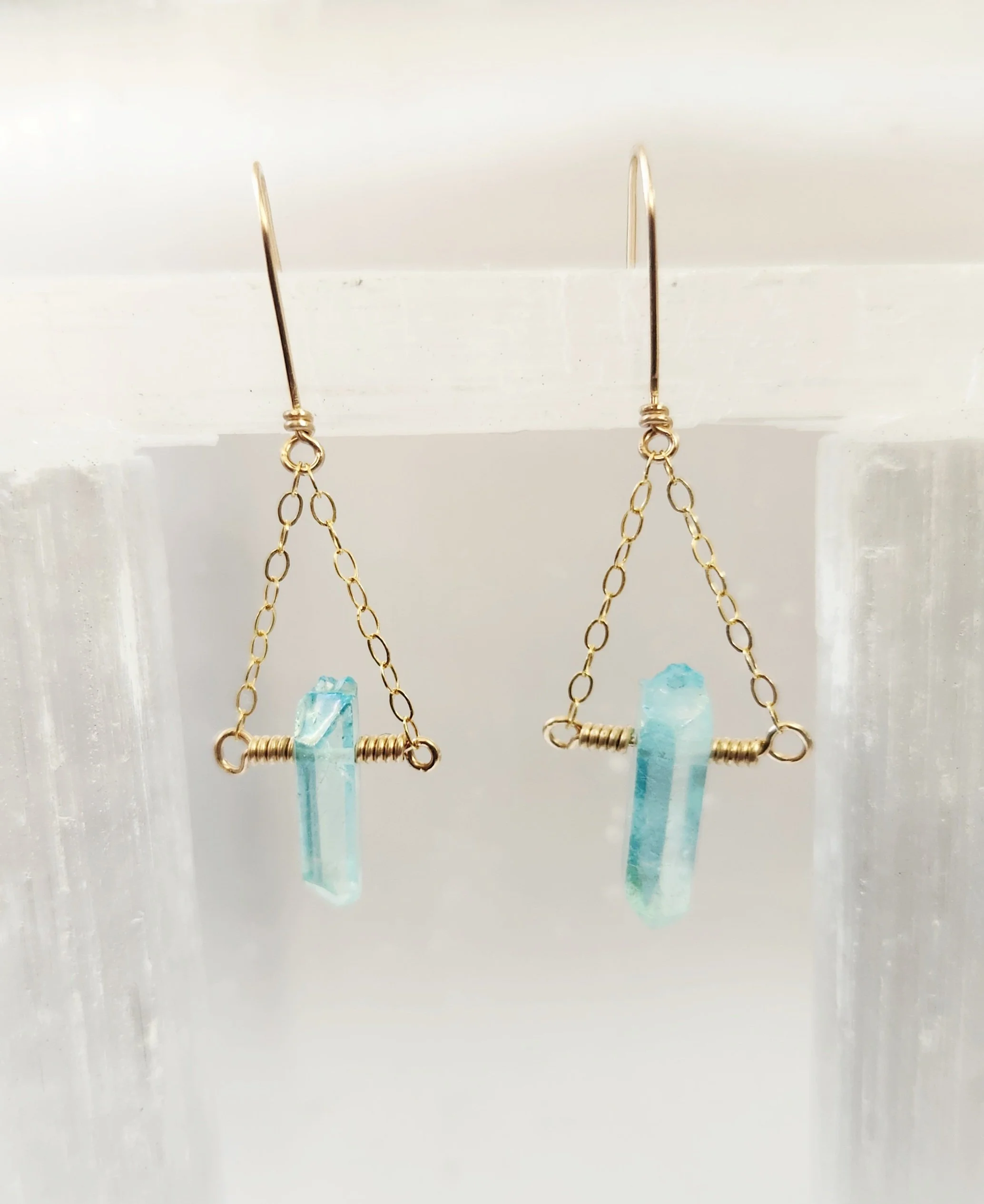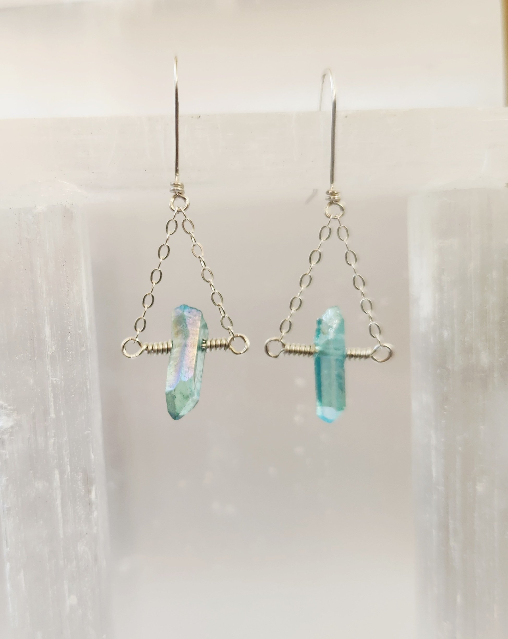 These earring really are too cool for school! Mint Green Aura titanium coated crystal quartz. Accented with fine gauge chain and hung from hand forged fish hook ear wires. Available in sterling silver and 14 karat yellow gold fill. Please note due to the nature of the stone and the titanium coating, no 2 stones are exactly alike. I will do my best to match as similarly as I can to what is pictured.