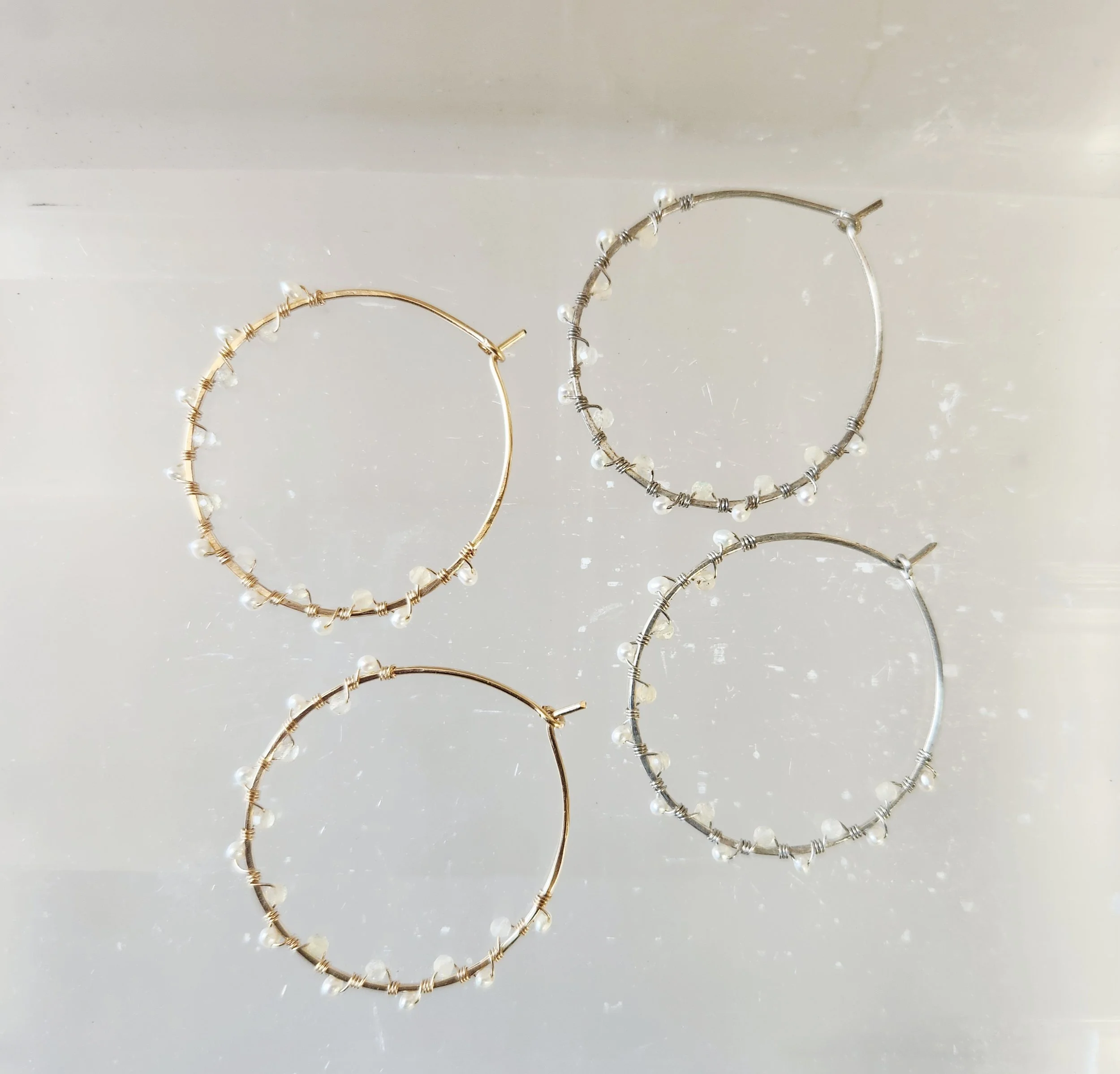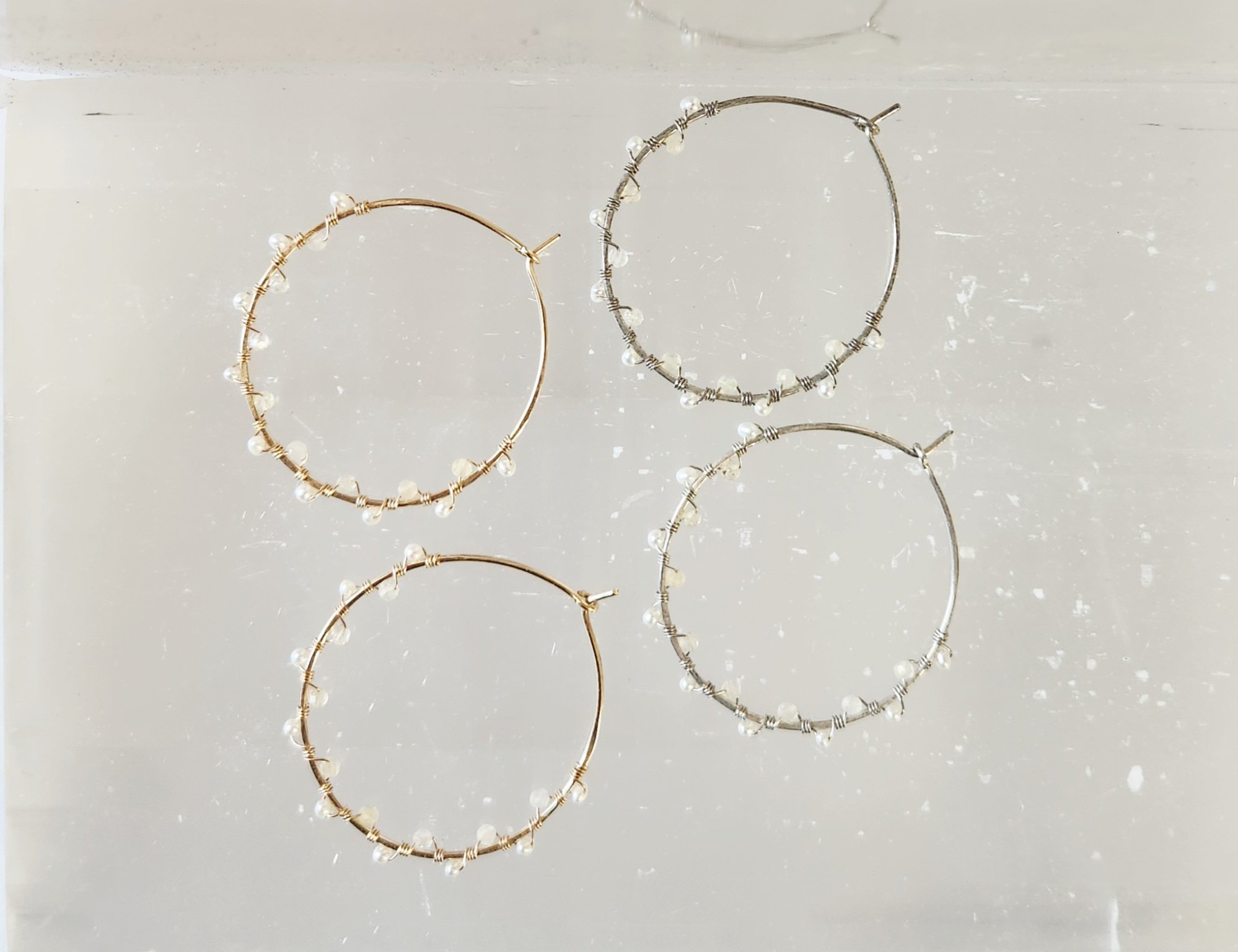 The perfect size hoop earring; universally flattering, and here offered in lovely 14 karat yellow gold fill. Hand formed and forged hoops that have been meticulously wire wrapped with gorgeous natural opals and tiny white pearls. Accented with luminous freshwater pearls. Also available in Sterling Silver.