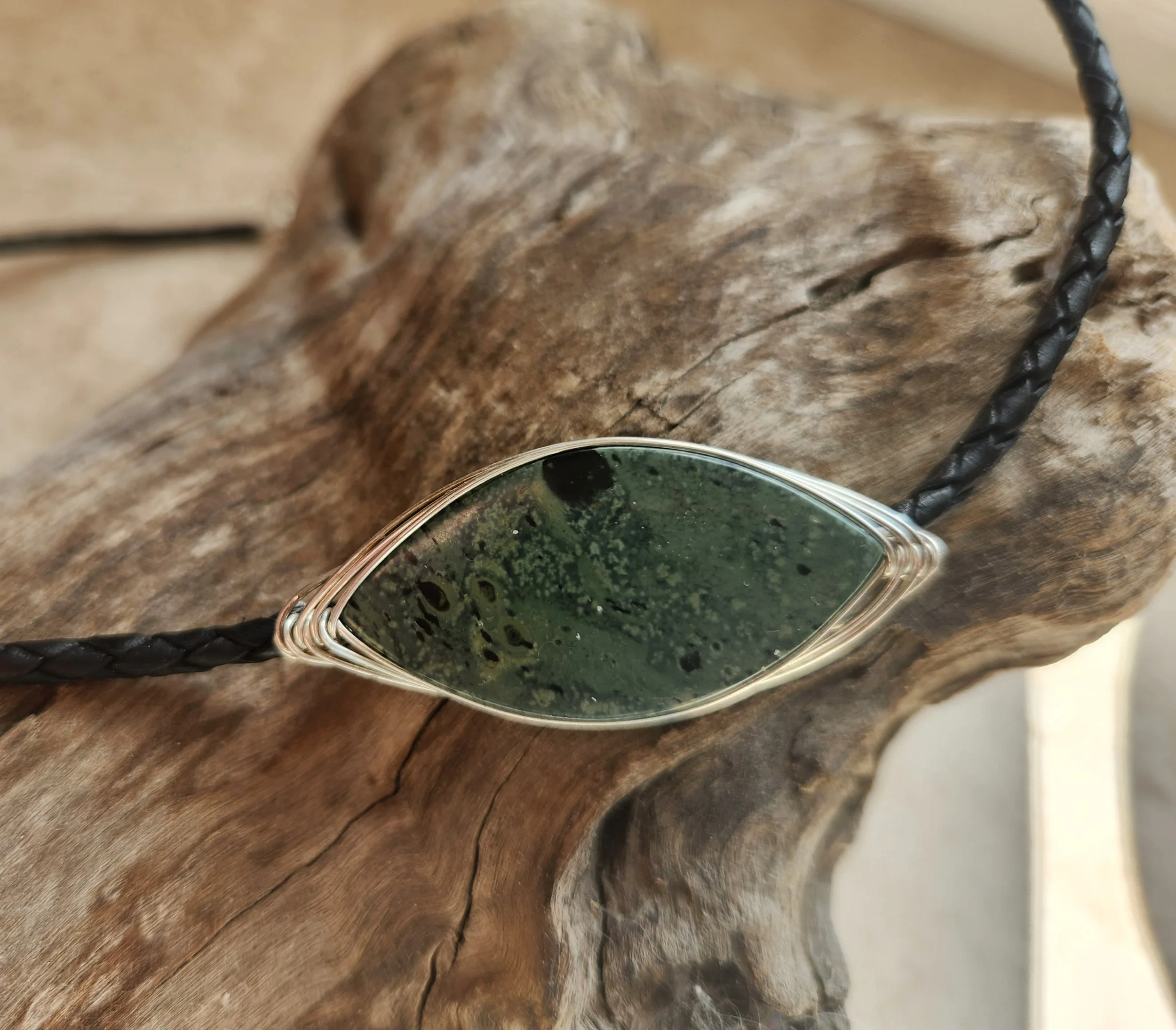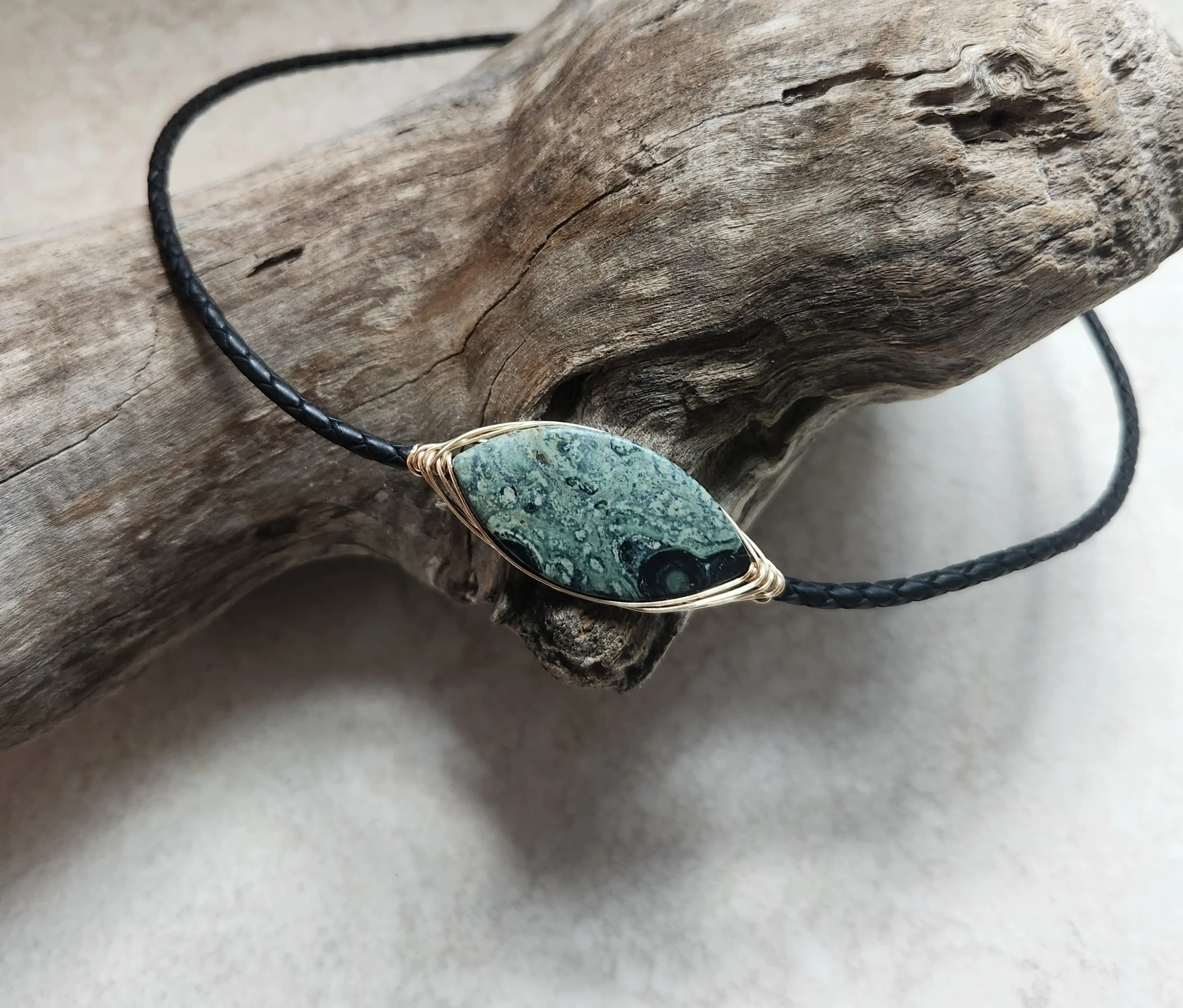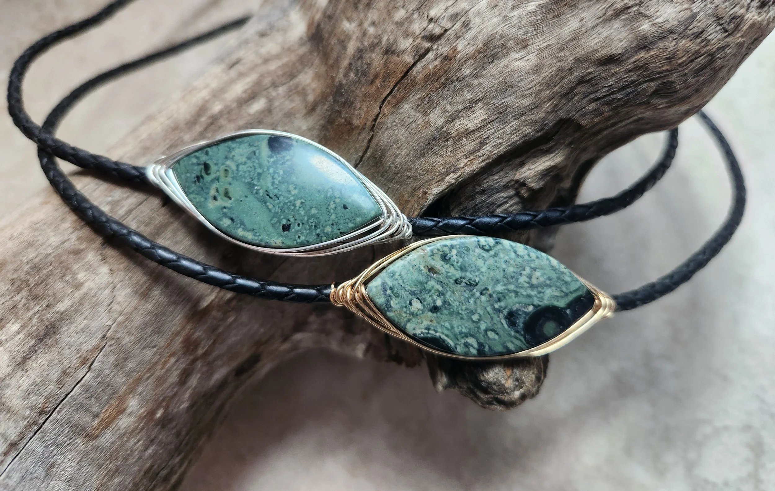 KDMENS Kambaba Jasper Wire Wrap and Leather Necklace Silver Gold Unisex Limited Edition