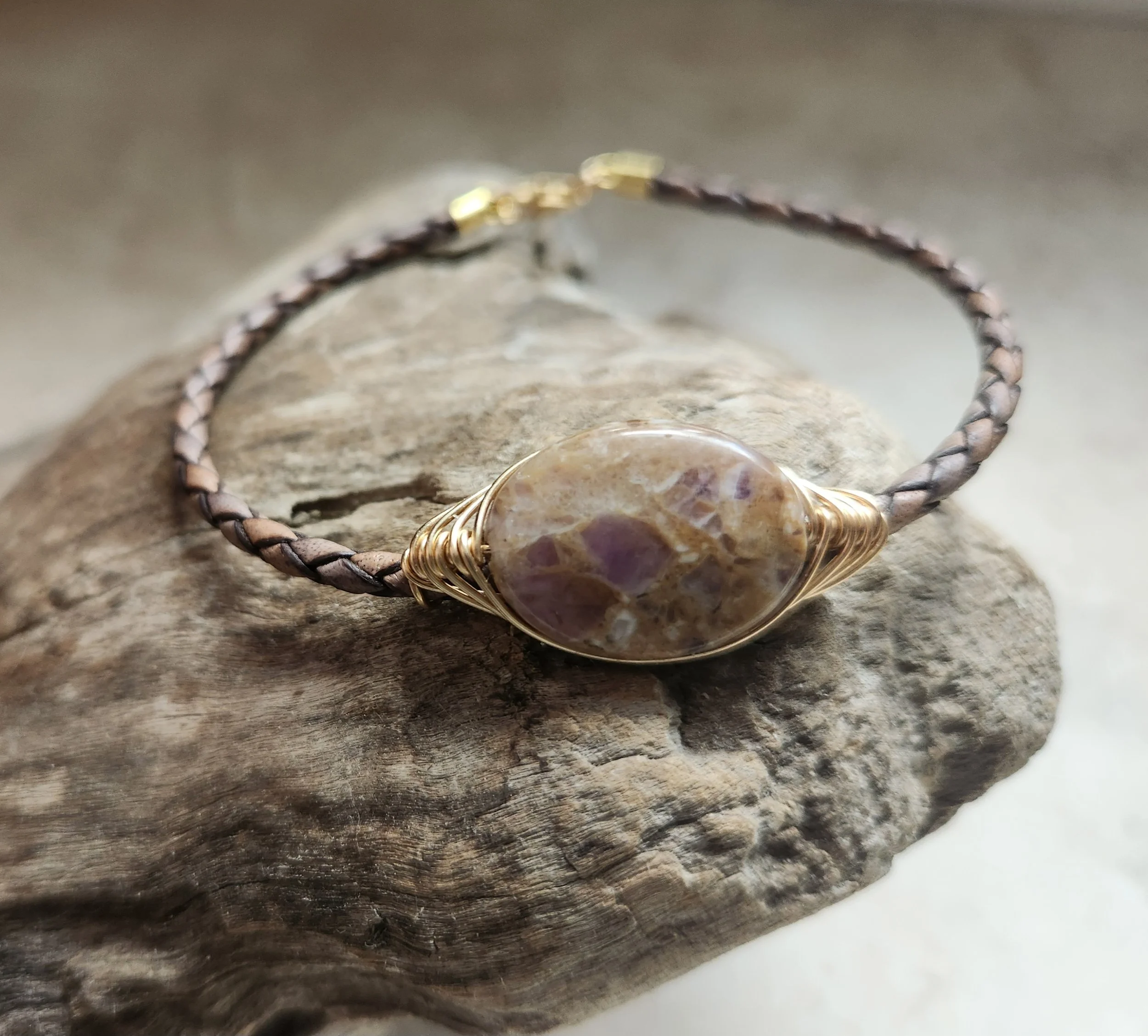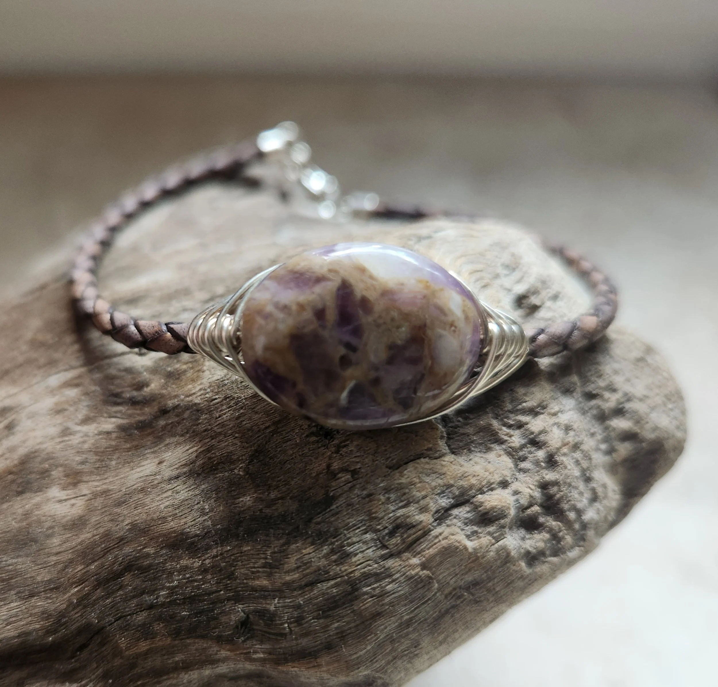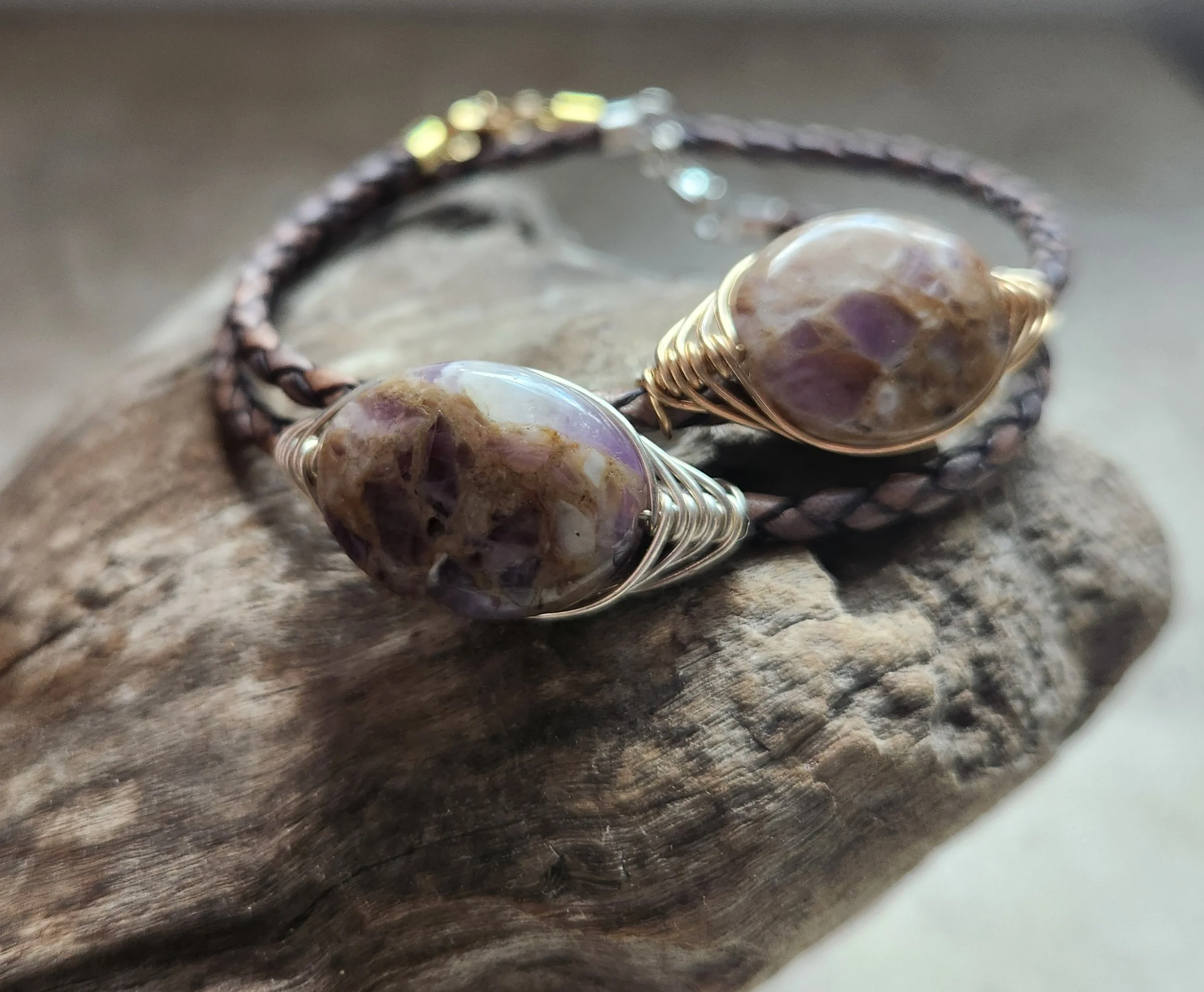 KDMENS Natural Amethys Wire Wrap and Leather Bracelet Silver Gold Unisex Limited Edition