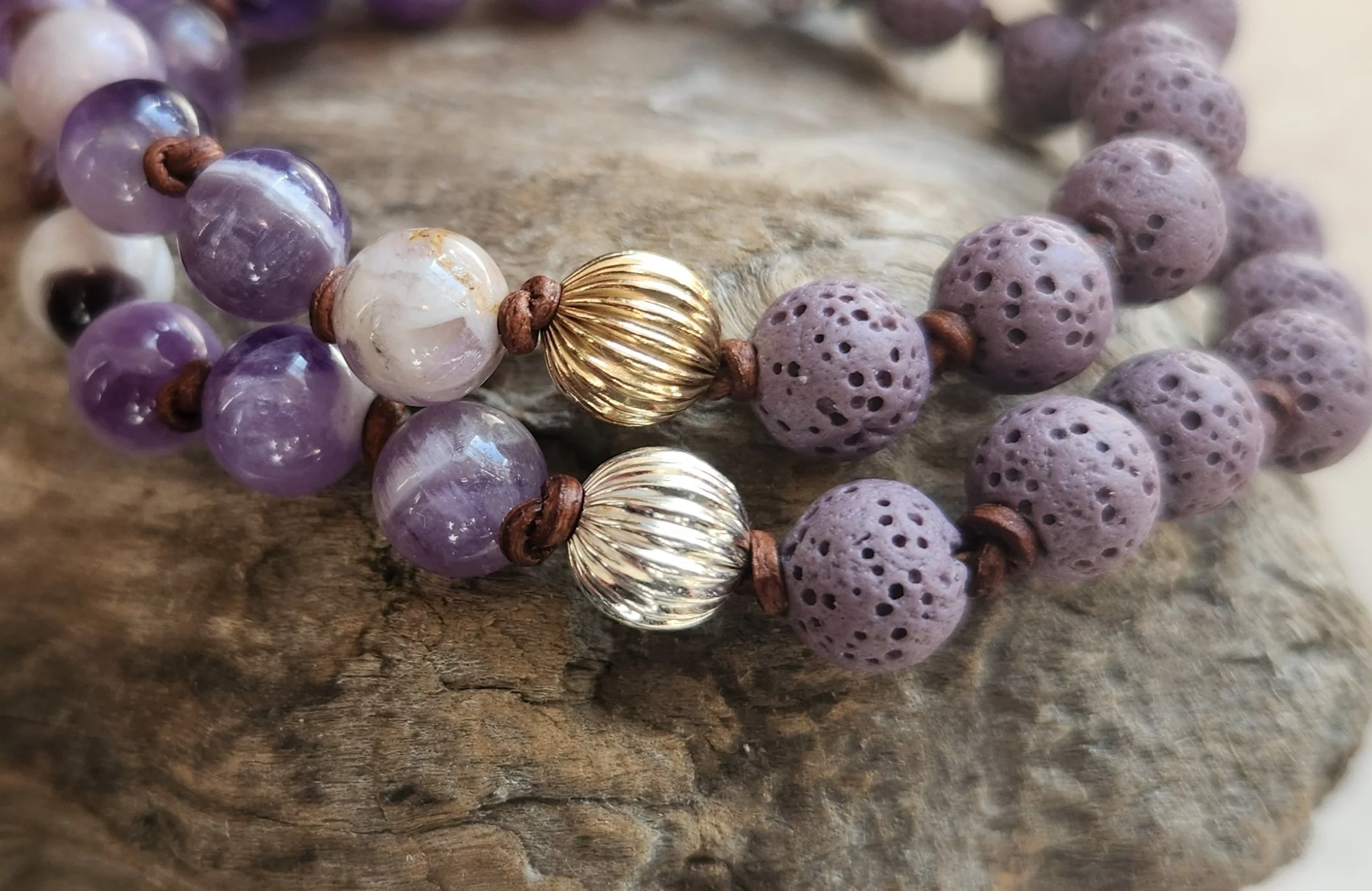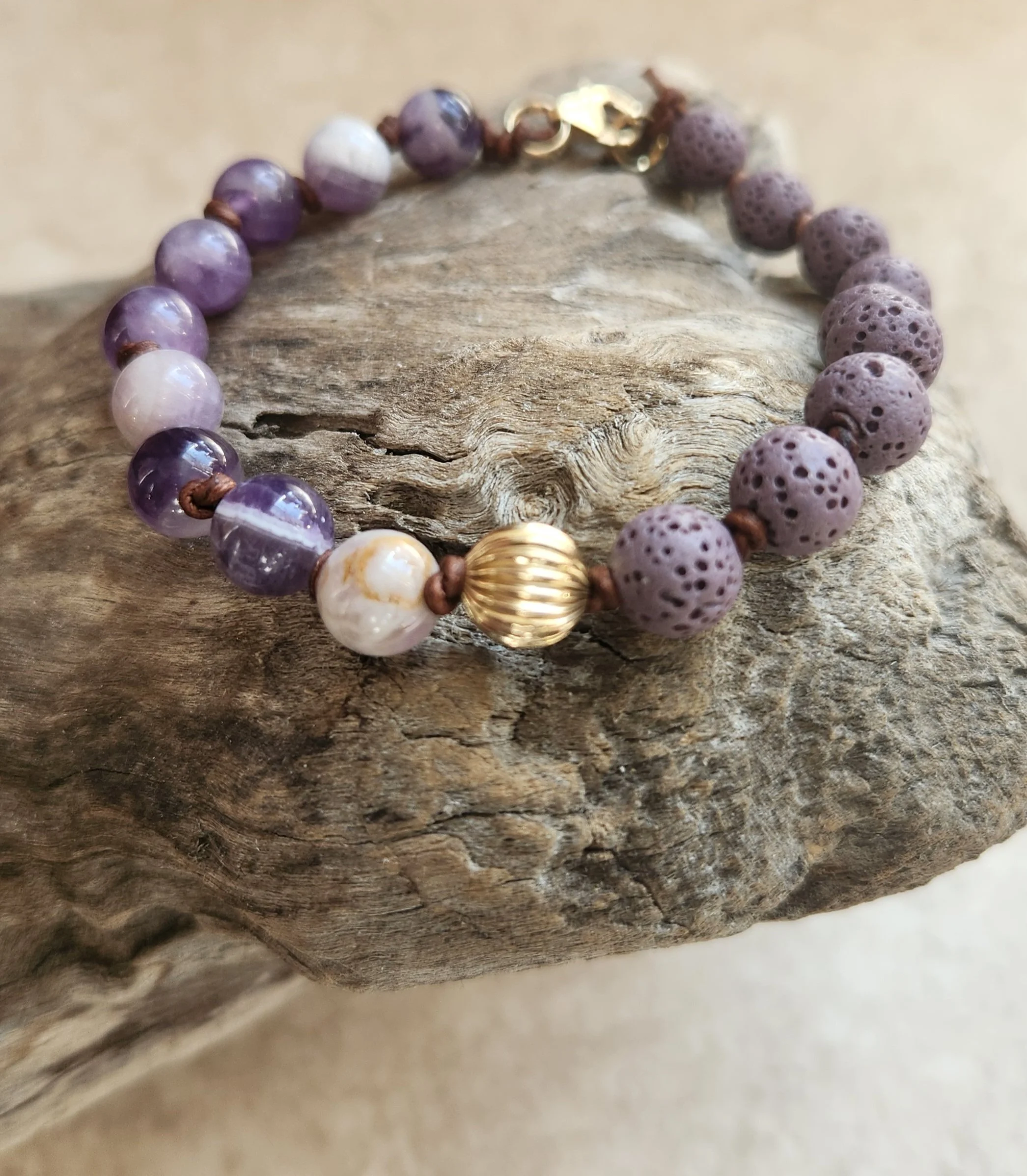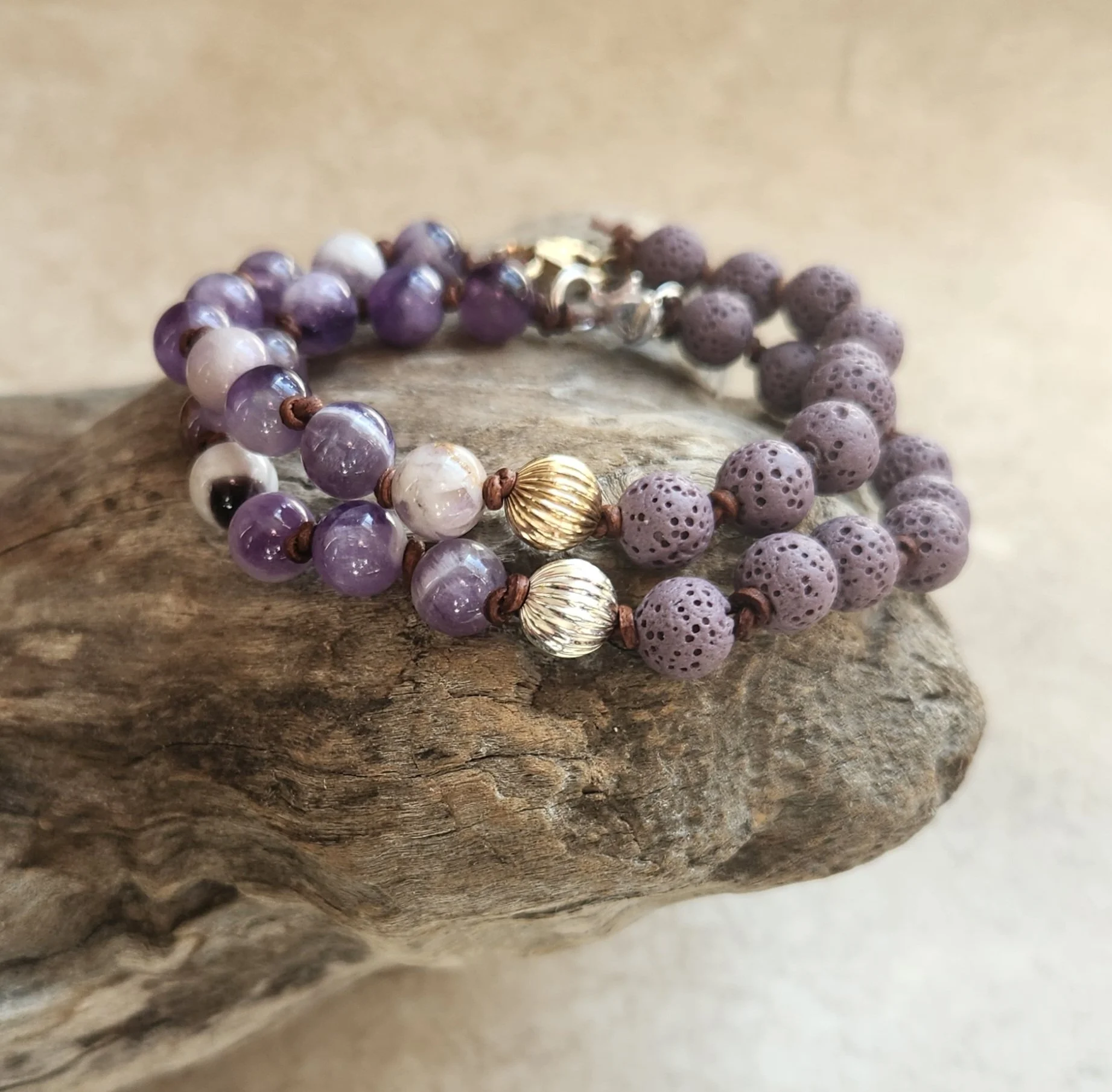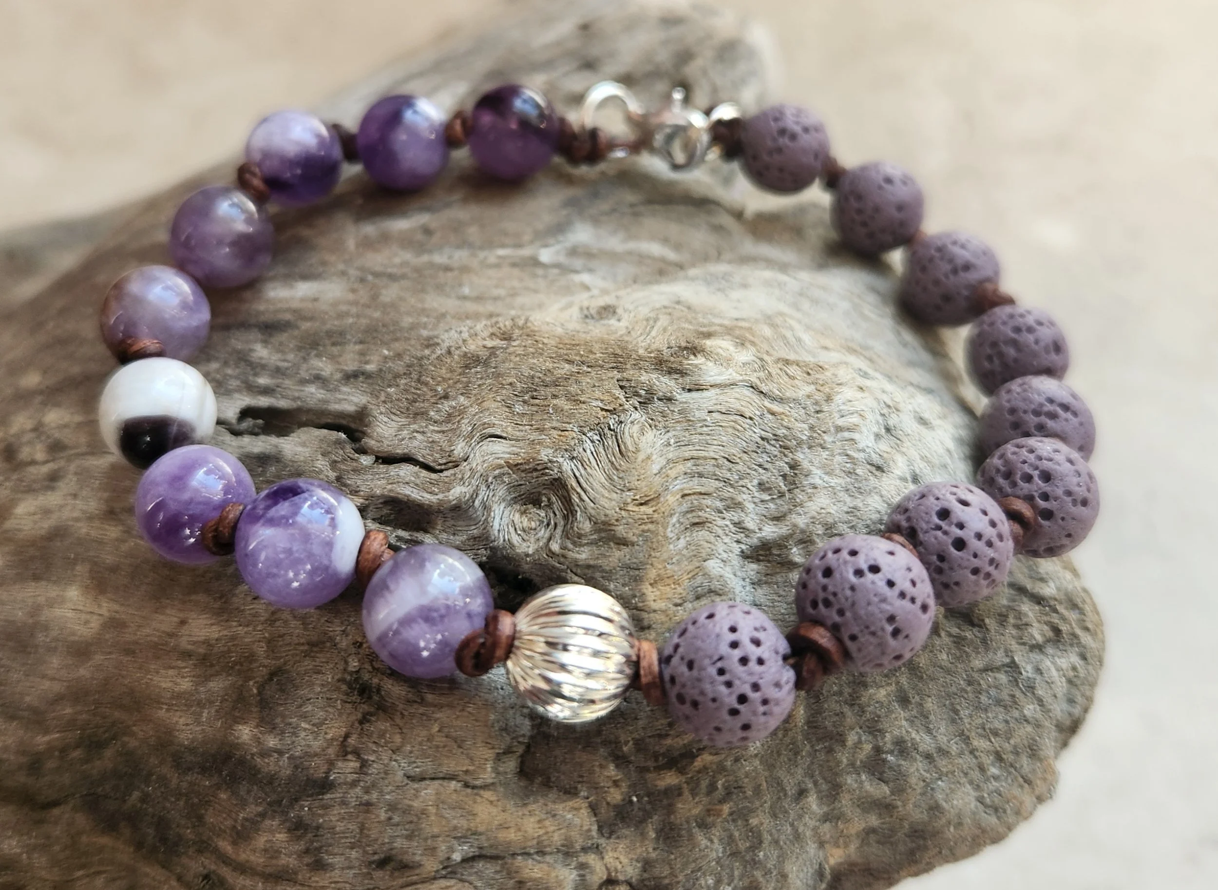 Natural Amethyst and Purple Lava on each side of a focal stone in your choice of Sterling Silver or 14 K Gold fill beads and finished with lobster claw clasp. 8" in length. Custom length available upon request.
