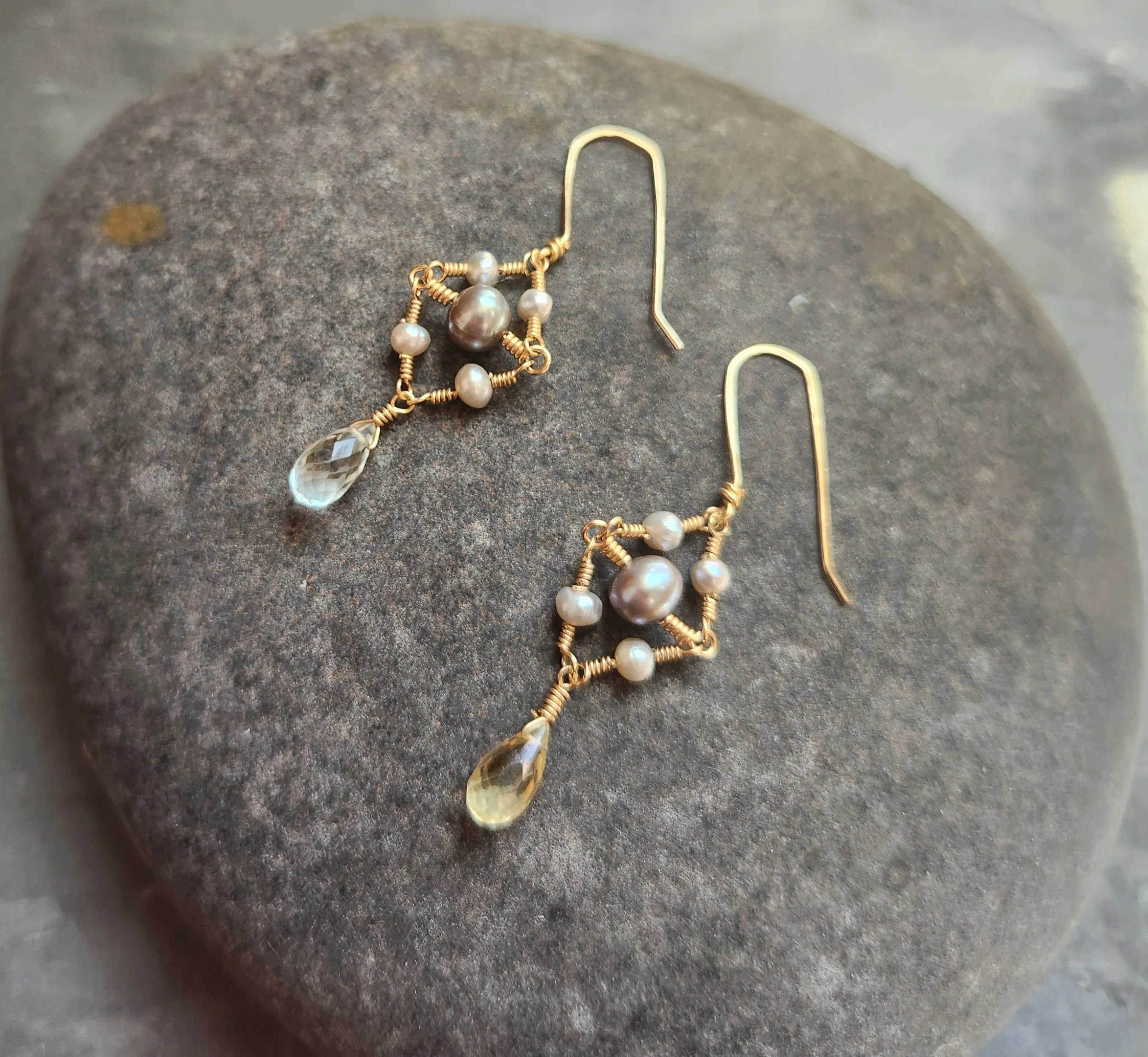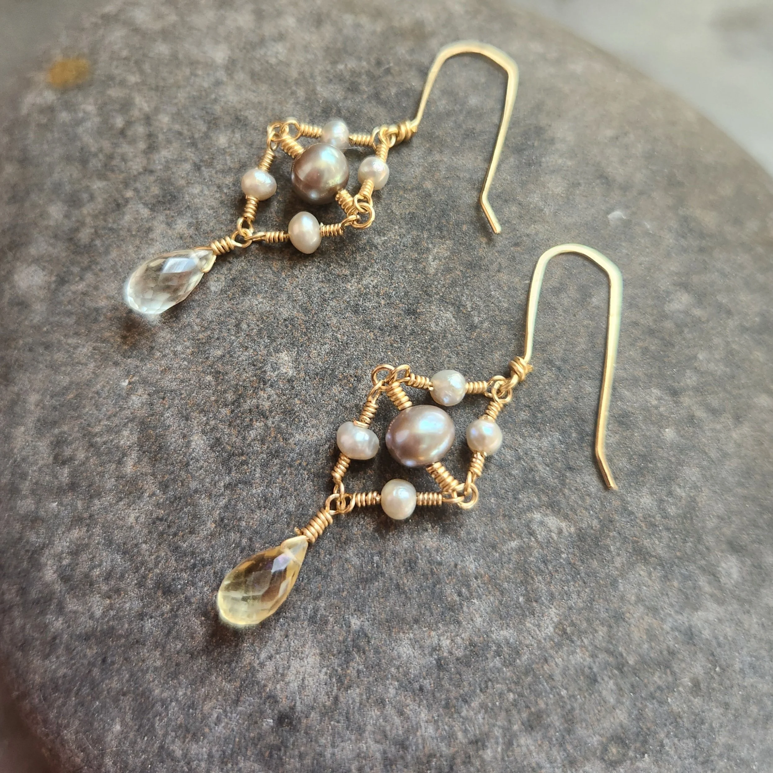 This earring design was the result of one one of my favorite parts of being an artist; the original design I created for the statement bracelet in this Collection just did not work and the final execution inspired this earring! 14 K gold fill wire, freshwater pearls, and sparkling mystic green amethyst briolettes. Absolutely one of a kind.