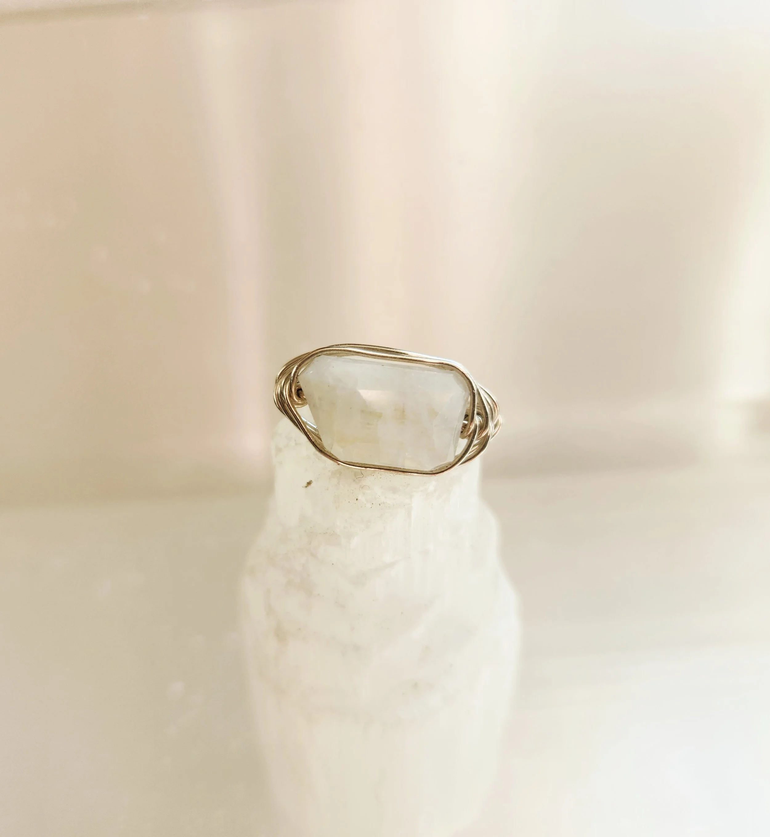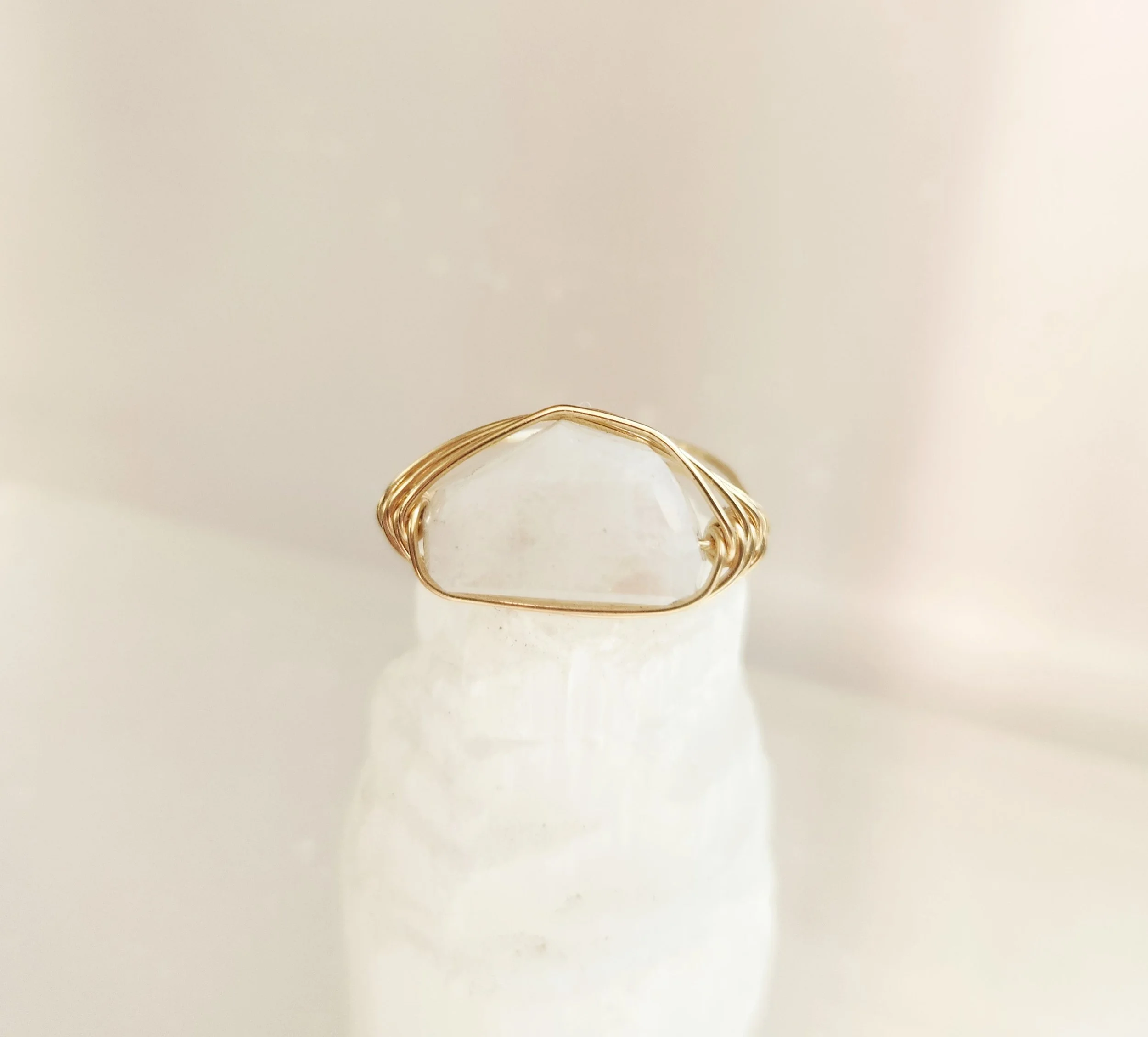 Stunning faceted natural Rainbow Moonstone Nugget Ring. Intricately wrapped in wire and hammered band. Available in Sterling Silver, or 14 Karat gold fill wire. Available in whole sizes 5-9.